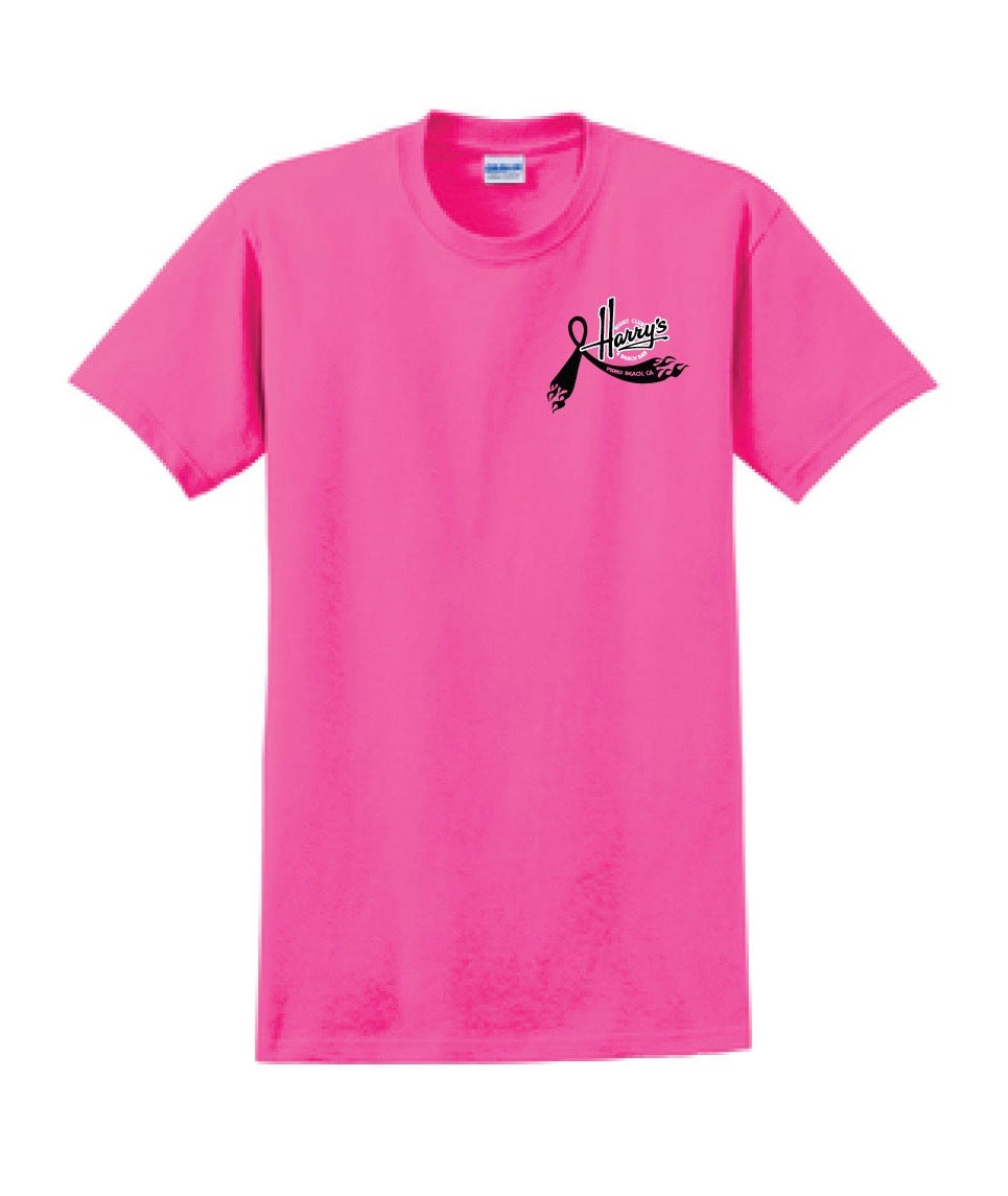 The new limited edition breast cancer tee shirt is available in both pink and gray. Harry's logo is displayed largely on the back, as well as the top left corner of the front.